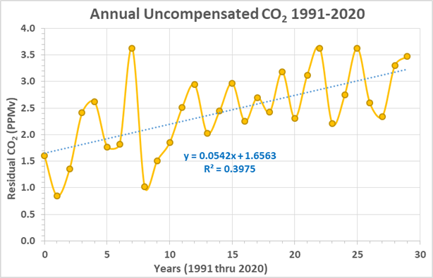 One might argue that the main driver of the upward trend of CO2 is either increased anthropogenic emissions, which is the default claim, or one could argue that the active sinks simply aren’t keeping up with changes in the temperature-driven emissions. The uncompensated residual at the end of the Summer drawdown is on average about 2.5 PPMv, for the 30-year period. Thus, the next season starts at a base-line that is elevated above the previous season base-line. The drawdown phase is not compensating for the increasing ramp-up. Figure 4, following, illustrates this.
