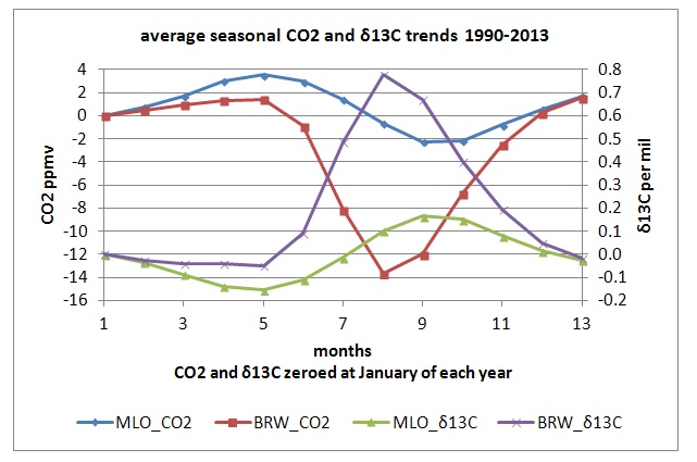 Moreover even at Barrow, the CO2 changes are from vegetation, not from the oceans, as the opposite CO2 and 13C changes show
