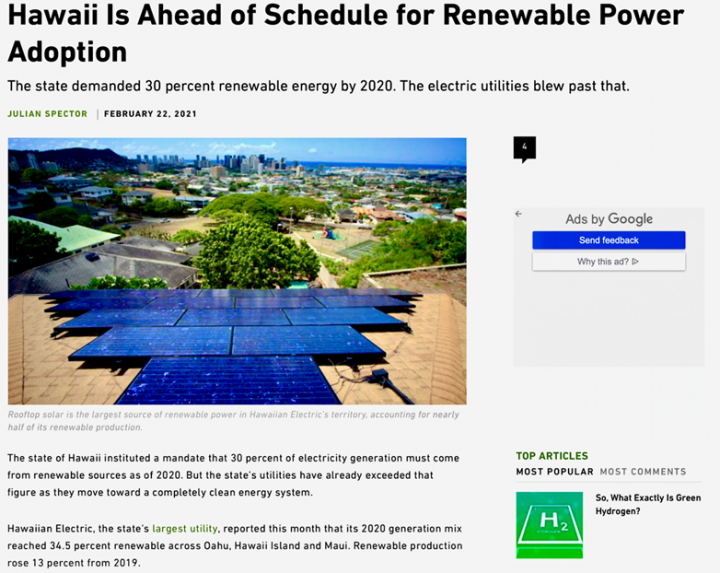 Other articles hype claims made by the state that it is moving so rapidly in increasing renewable electricity that it not only achieved year 2020 renewable energy contributions to meet the 30% target set for electric utilities by December 31, 2020 it “blew past that” target as noted by Hawaiian Electric’s claim of 34.5% of renewable energy electricity in year 2020 as the state moves toward “a completely clean energy system.”