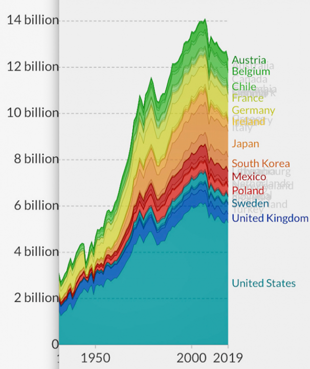 The world’s developing nations led by China and India are completely responsible for all global CO2 emissions increases since about 2005 with a growth of nearly 8.2 billion metric tons as depicted below with the incredibly sharp rise driven by China and India clearly apparent in the 2005 through 2019 time period.