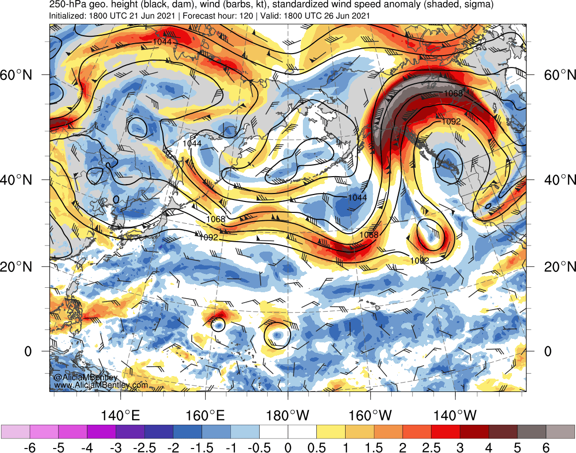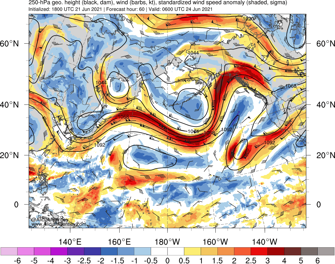 By June 24th, the jet stream has started to buckle, with major waviness over the north Pacific.
