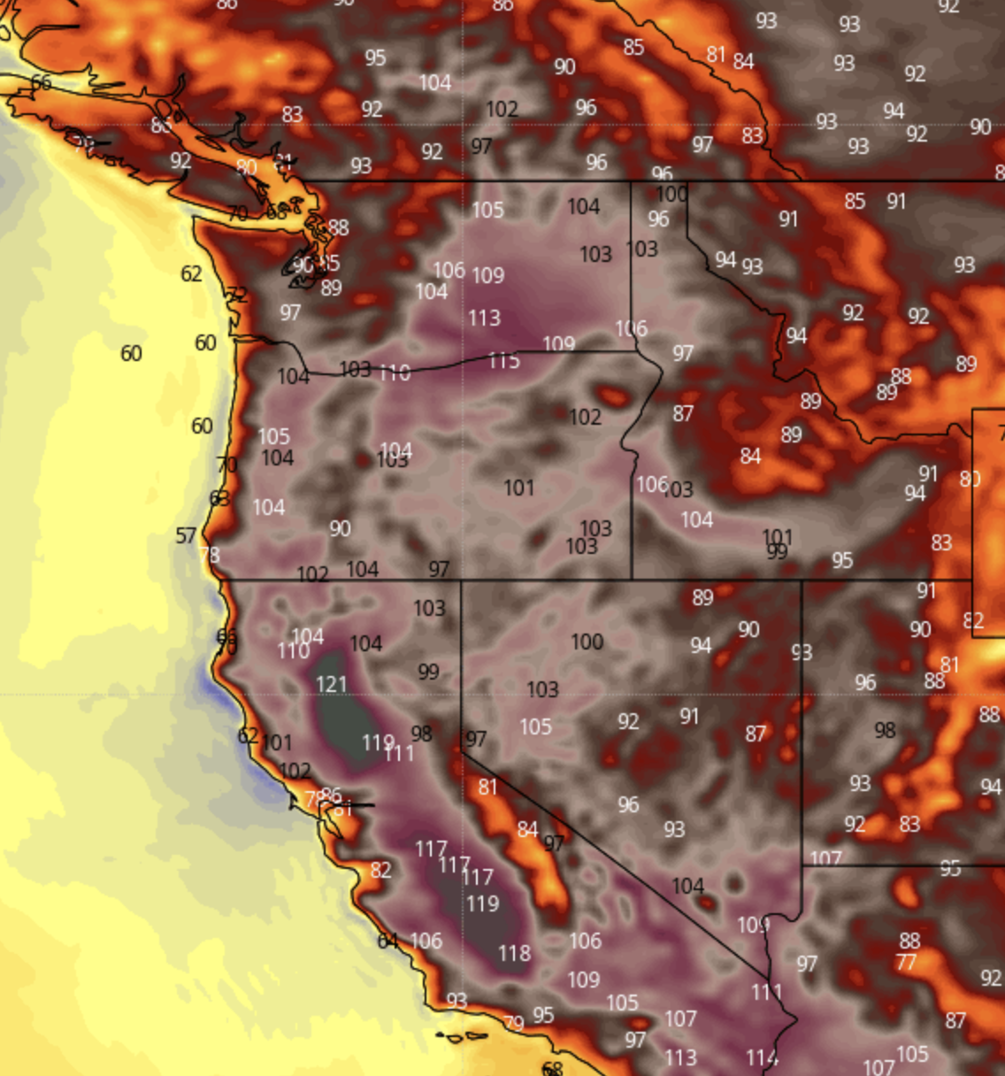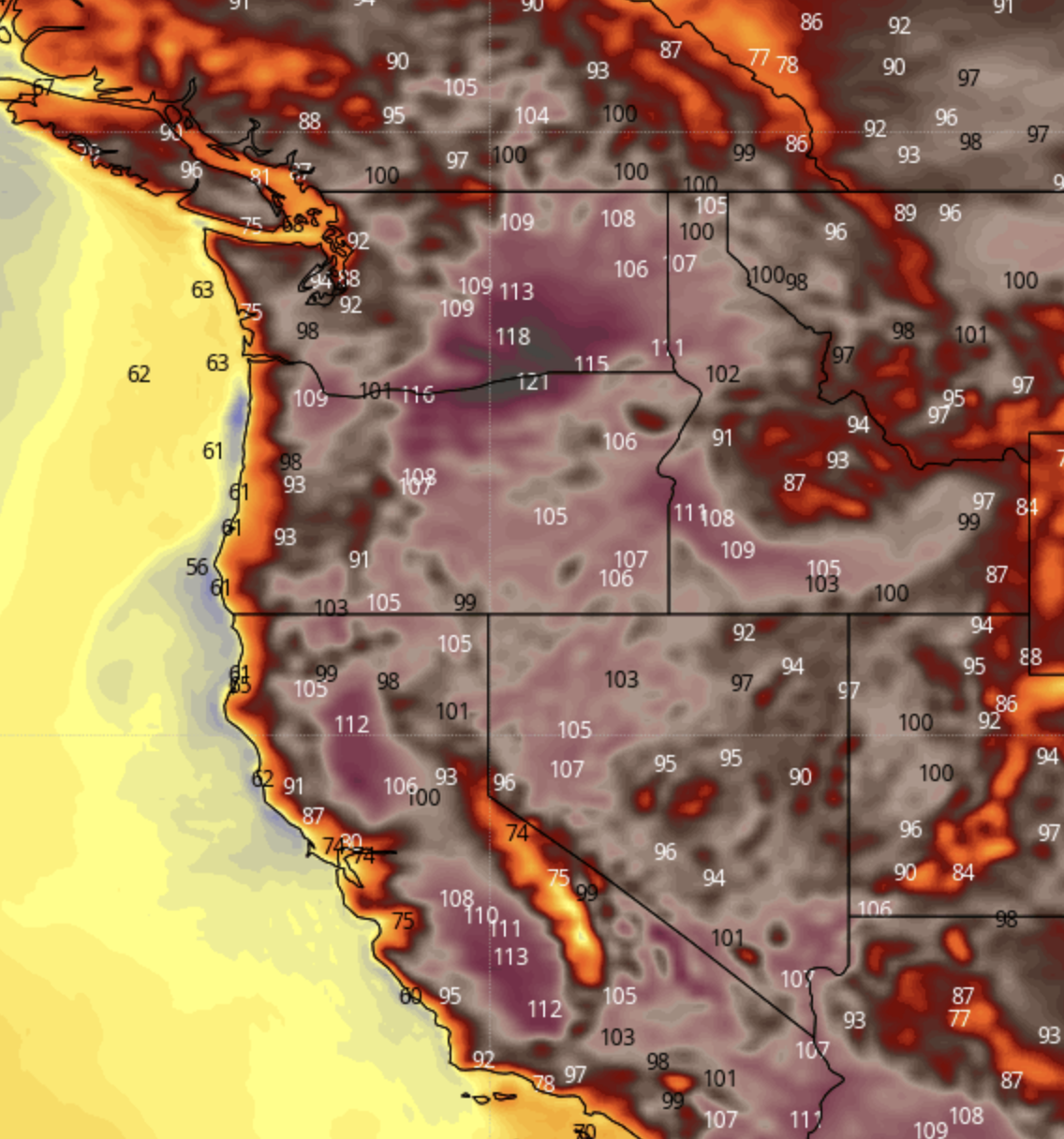 Monday afternoon, Portland is predicted to get to 109F, and 121F is forecast near the Oregon/WA border.