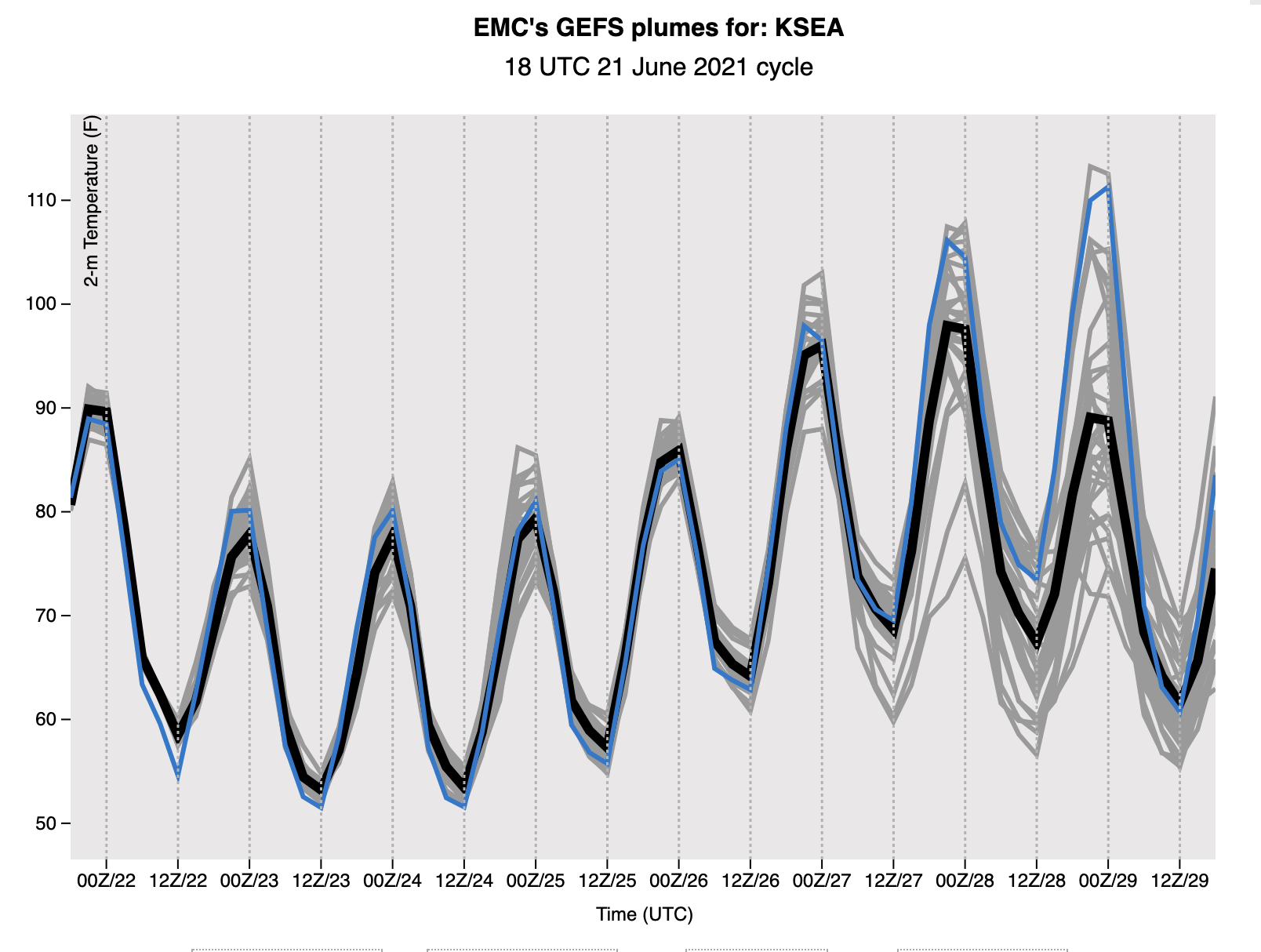 For Monday, the high-resolution run gets to 111F in SEATTLE (the highest on record is 103F); it appears to be an outlier: most of the ensemble forecasts (gray lines) are cooler, with their mean (black line} only reaching 90F.