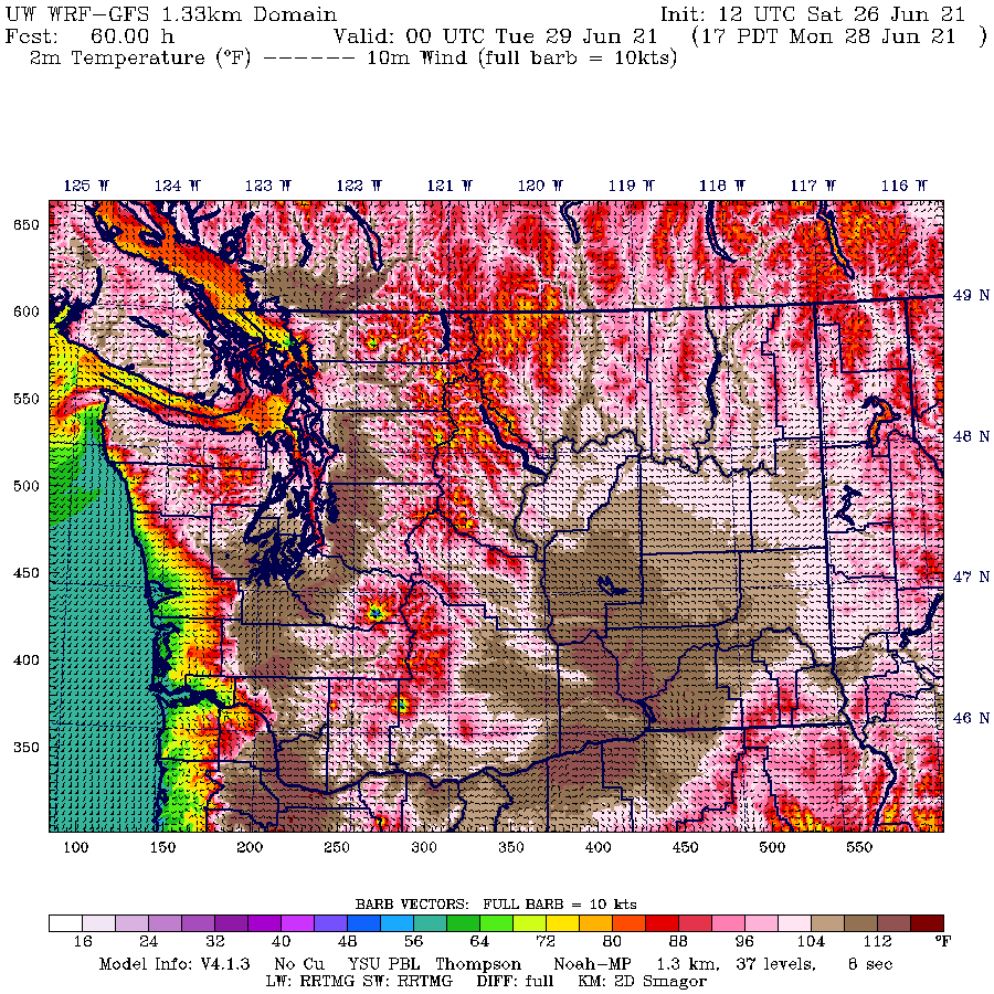 Just madness. If you are right on Puget Sound temperatures will be tolerable (80s), but go inland a few miles and temperatures will zoom above 104F. Go inland a bit more, temperatures will be above 110F. I have provided a zoomed-in view for better viewing below. I never expected to see such temperatures in my lifetime.