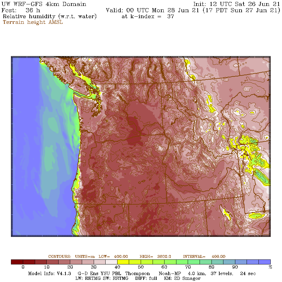 Here is the predicted relative humidity at the same time (5 PM Sunday): most of the region will have relative humidity below 30%. Sweating or wetting your skin will provide substantial cooling. Very good.