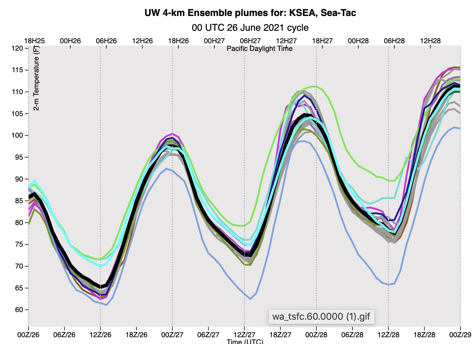Here is the University of Washington high-resolution ensemble prediction for the temperature at Seattle Tacoma Airport, with the black line indicating the mean of all the forecasts (a good forecast in general). Today (00/27) has the ensembles on the same page (the upper 90s). More variations on Sunday, but nearly all above 100F (man about 104-105). And on Monday the mean is around 110F, with a range of 100-115. Yikes.