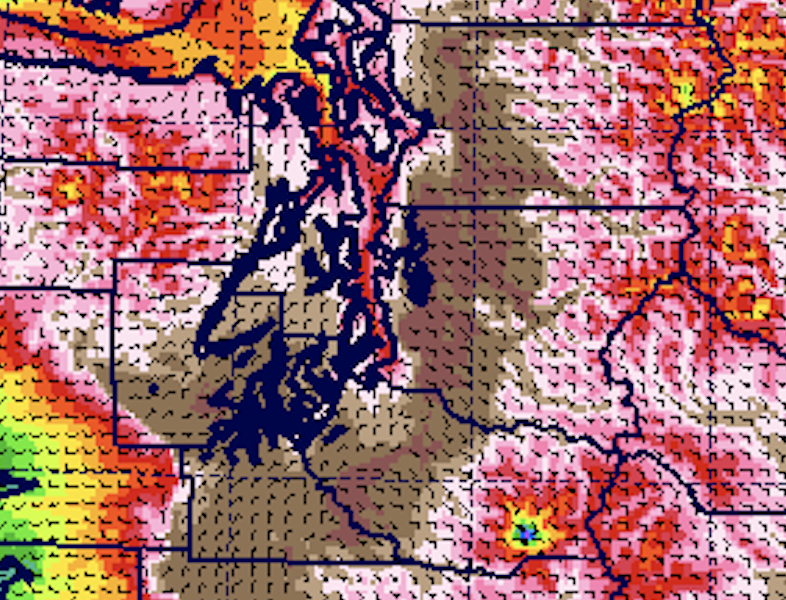 One such tool is ultra-high resolution numerical weather prediction models. My group at the University of Washington runs the highest-resolution operational weather prediction system in the region, with a grid spacing of 1.3 km. High enough resolution to get many of the local water bodies approximately correct, as well as the impacts of our regional terrain features.
