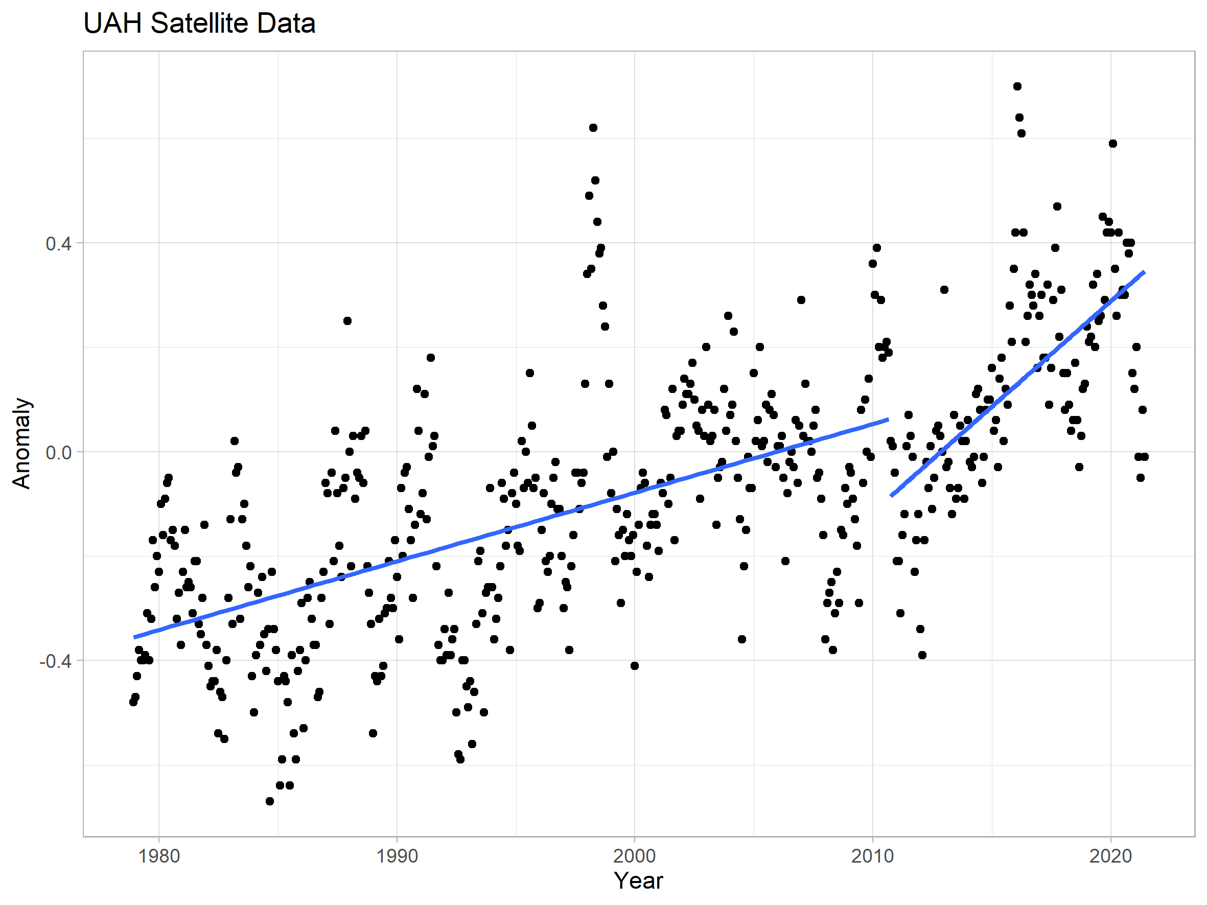 The latest UAH temperature anomalies show that the New Pause has lengthened by another two months to 6 years 10 months. As usual, the Pause is defined as the longest period, up to the most recent month for which data are available, during which the linear-regression trend on the monthly global mean lower-troposphere temperature anomalies shows no increase.