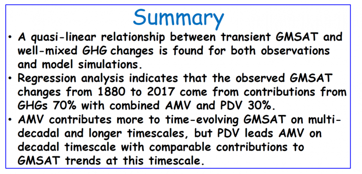 Last month I said that Wu et al. (2019) had concluded that 70% of all warming since 1880 was anthropogenic. A Thermageddonite objected. So here is a slide from a presentation by Aixie Hu, the paper’s second author, given at a conference jointly sponsored by NCAR, the U.S. Energy Department and the National Science Foundation. The second bullet-point confirms the explicitly-stated conclusion of the paper itself that 70% of the observed industrial-era changes in global mean surface air temperature came from greenhouse gases, with 30% from Atlantic multidecadal and Pacific decadal variabilities: