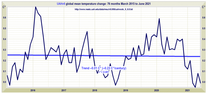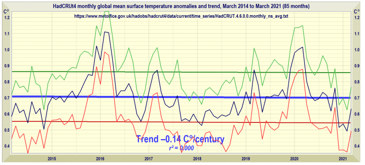 The HadCRUT4 dataset is no longer being updated monthly. For last month’s column I had to kick them into producing the data for the first three months of 2021, reflected in the graph below, which shows no warming at the surface for 7 years 1 month. They are now another three months behind. The HadCRUT5 dataset is even worse: it has not been updated since the end of 2020.