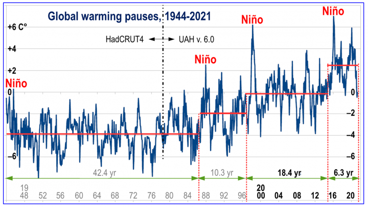 In Chris’ graph, I have highlighted the most prominent el Niño in each of the four Pauses in global warming that he has identified. Each record-breaking el Niño appears near the beginning of its Pause.