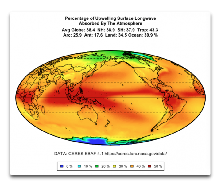 Agreed. My first thought was that this was also a map of the amount of water vapor in the atmosphere. There is a very good correlation between water vapor and absorption. This shows that CO2 is not doing most of the absorption.