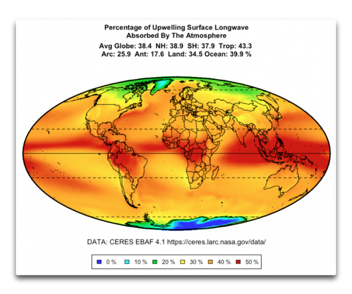 The use of a percentage to measure the “greenhouse effect” eliminates one of the variables. Where it is warmer the ground emits more radiation, so naturally more will be absorbed by the atmosphere. That means if we want to compare different areas of the earth, we need to use percentages instead of absolute values. Below are two graphs showing the percentage of the upwelling surface longwave radiation absorbed by the atmosphere, shown from two opposite sides of the planet.