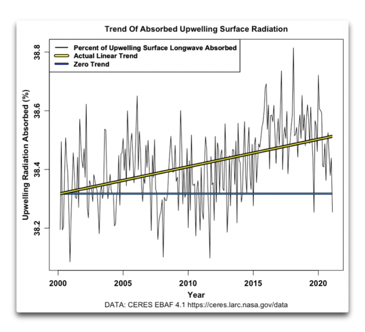 Much is made by climate alarmists of the fact that the percentage of the upwelling surface radiation absorbed by the atmosphere is increasing. This indeed shows that the greenhouse effect is real … but it shows nothing about whether that affects the temperature. Figure 3 shows the rate of increase.