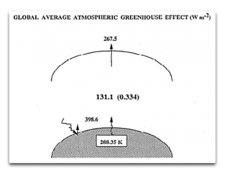 Figure 1. Drawing by Ramanathan showing upwelling surface longwave of 398.6 watts per square meter (W/m2), TOA radiation to space of 267.5 W/m2, and atmospheric absorption (greenhouse effect) of 131.1 W/m2. Note that Ramanathan has also calculated the absorption as a fraction of surface radiation (0.334, or 33.4% of radiation absorbed).