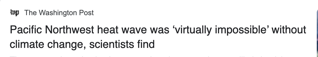 The most recent, of course, is the World Weather Attribution (WWA) report on the Northwest heatwave, which provoked stark headlines throughout the planet (see below for a sample). Yes, even the Seattle Times featured it.