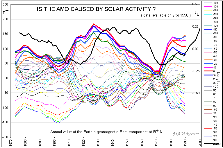 When I found about this effect some years before above paper was published, I had a go at data from ETHZ, then available only to 1990. I found that the horizontal (east) component varied greatly around globe at various latitudes and longitudes, but interesting part was when I came across N. Atlantic area (45-70N and -30 to 10 E) I found that there is a significant correlation with the AMO, the major component in the global temperature variability.