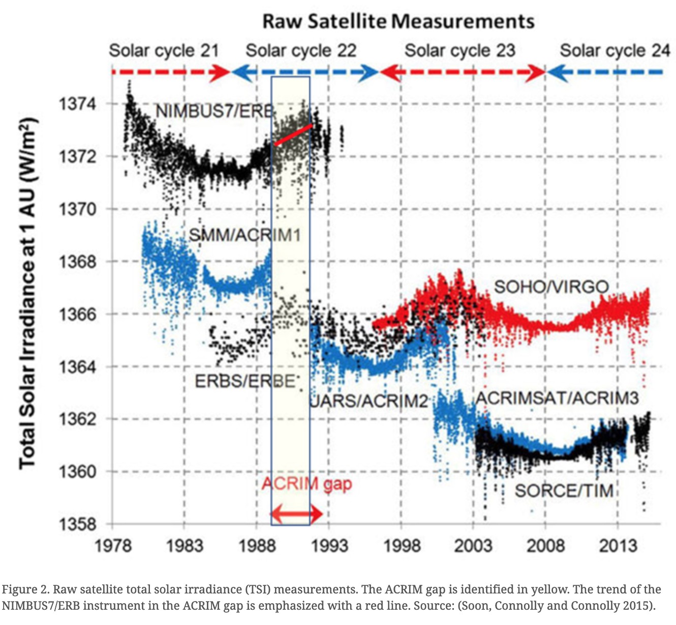Most writers only consider “TSI” or Total Solar Irradiance, when they consider solar RF delivered to Earth, but the Sun varies in other ways that influence our climate independently of the Sun’s direct total radiation output. For example, the Sun’s UV (ultraviolet) radiation varies more than the total and the Sun’s magnetic field strength varies significantly at Earth’s orbit, as well as the power of the so-called “solar wind” of charged particles (Haigh, 2011). TSI variation is not the only way the Sun can influence our climate, but it is something we can measure. Unfortunately, some scientists often only focus on those things they can measure and consider unmeasurable quantities to be “insignificant,” whether they are or not. We will limit this post to TSI variability but be aware it is only part of the story.