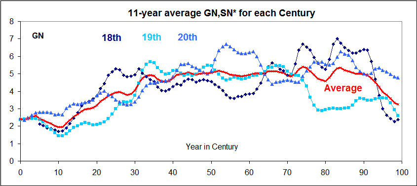 Perhaps it will help you over the hump to study solar activity plotted for each of the last three full centuries: