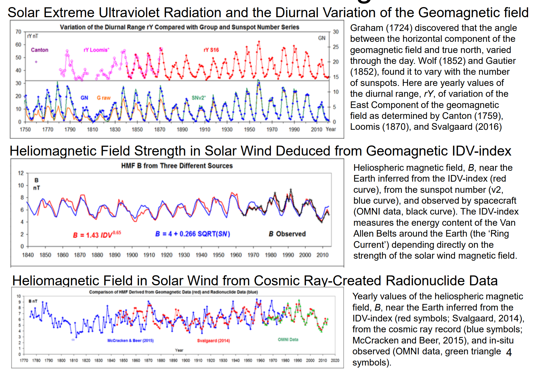 From 1750 onward we have much better data. Perhaps the best is the daily variation of the geomagnetic field which is completely quantitatively understood [can be calculated from basic physics and measured by sounding rockets]. Essentially, it is a variation of the compass needle’s deviation from pointing to true north. It was discovered way back in 1722 and is easily measured even with the simpler instruments back then and as an angle does not require calibration.The variation is a direct measurement of the solar EUV and varies with great fidelity just like the solar magnetic field and thus also like the sunspot number. So, we do know solar activity with the required precision [much better than the variation over a cycle] for the last 300 years. An inescapable conclusion is that there has not been any long-term trend over that time span. The number of magnetic storms [since the 1840’s] and the variation of cosmic rays [at least the last 600 years] also do not show any trend.