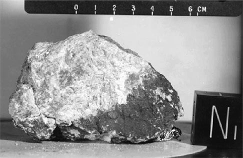 It is subdued in nature and apparently old. The samples collected from Spur Crater had a range of exposure ages indicating that the material excavated may have been pre-exposed and/or may include material added from other sources after the Spur event (Arvidson et al. 1975).During a Transearth Coast press conference, 15415 was called “Genesis Rock” and the name has stuck in spite of the fact that it may not be the oldest rock from the Moon. The astronauts correctly recognized that it was coarse-grained, made almost entirely of plagioclase and probably from the lunar highlands (figure 1). Thin sections also show that it is an anorthosite made almost entirely of coarse-grained plagioclase (figure 2) and that it is only mildly shocked. Age dating proved difficult, but an age of about 4 b.y. was determined by the Ar plateau method. However, the very low initial 87Sr/86Sr ratio attests to it great antiquity and the lack of meteoritical siderophiles proves its pristinity (lack of contamination by impacts).