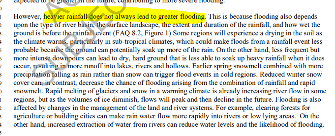 I’m very happy to see that the IPCC has acknowledged that heavier precipitation does not equate to increased flooding: “heavier rainfall does not always lead to greater flooding”