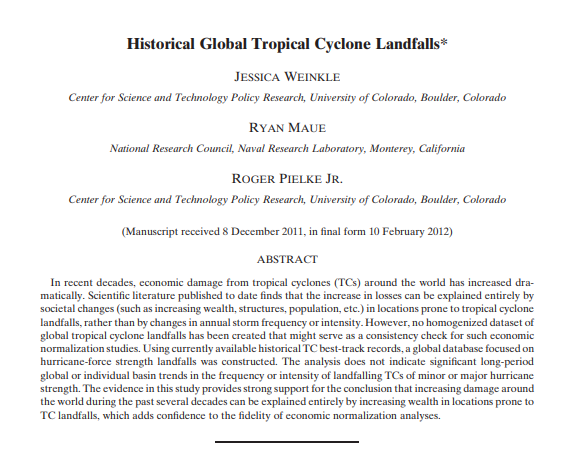 They reference normalized hurricane damage & cite a fringe analysis with 24 citations while ignoring the definitive work with 1196 citations