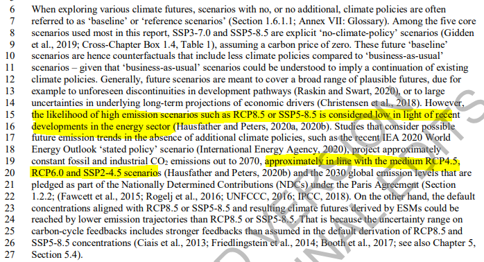 So IPCC recognizes that 8.5 scenarios have “low likelihood” but nonetheless choose to remain “neutral” with respect to scenario assumptions