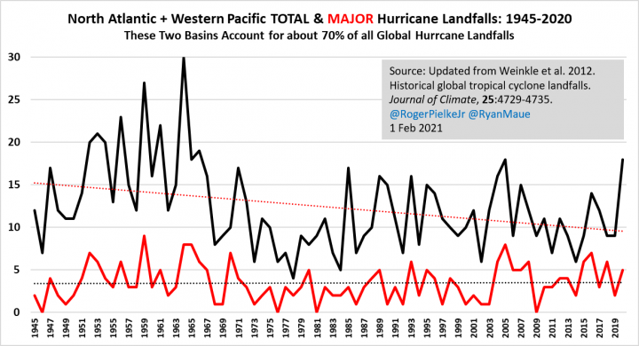 For NA & WP, about 70% of all landfalls, “the overall number of landfalling hurricanes has decreased dramatically since the 1940s, while the number of major hurricane landfalls has shown no trend”