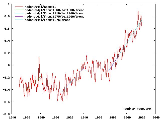 The difference being that the earlier 20 and 30-year trends stopped and went into reverse. The modern warming trend is now 46 years in length and shows no sign of letting up.