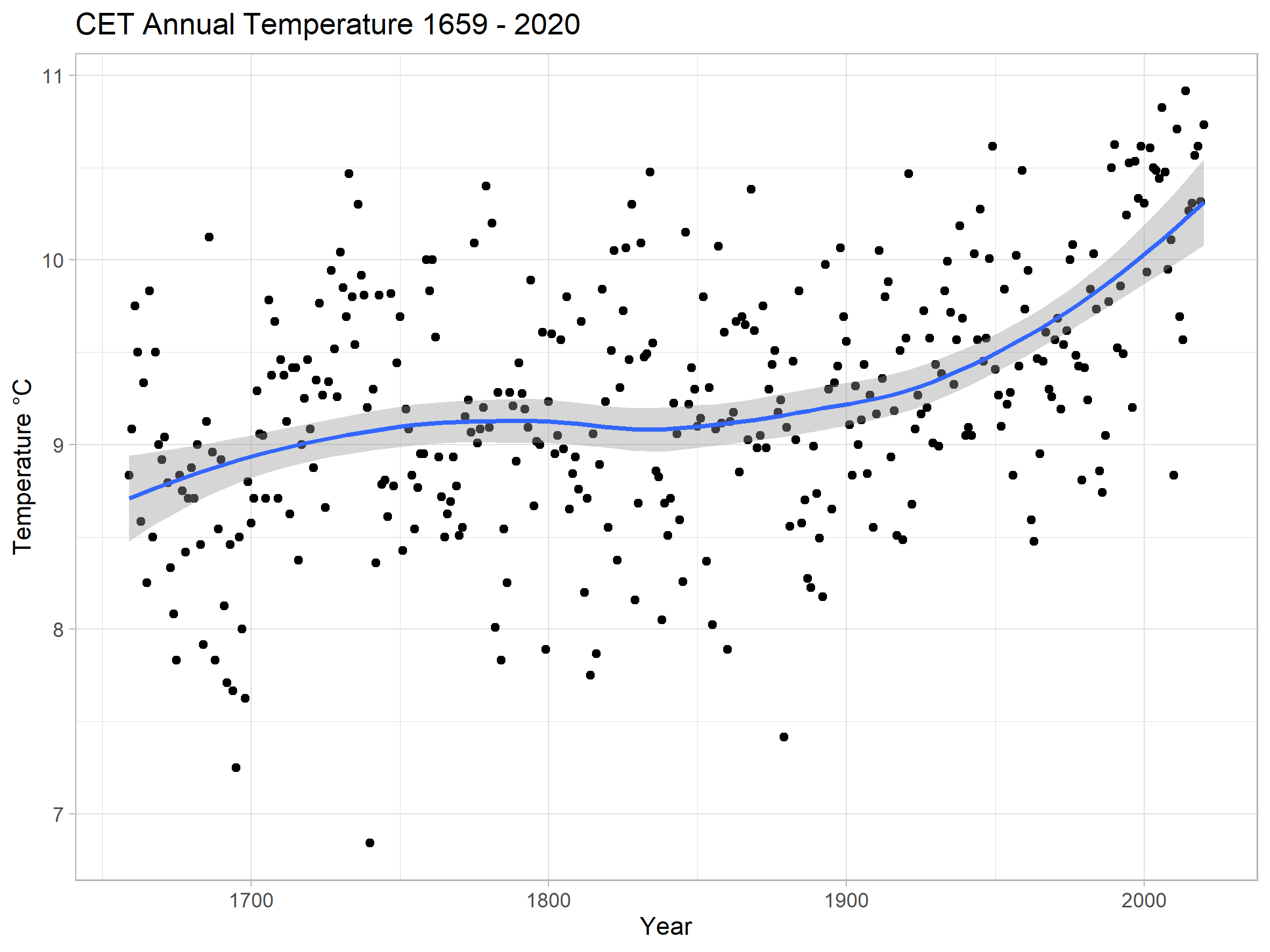 Trend in annual mean CET temperatures.