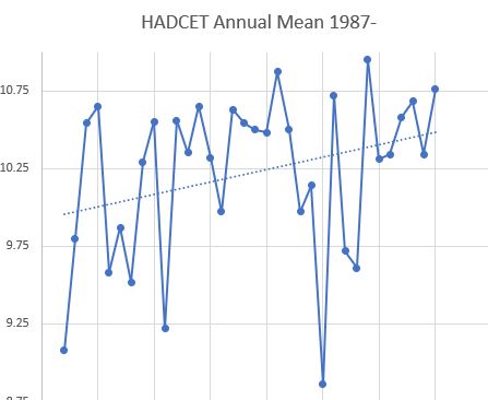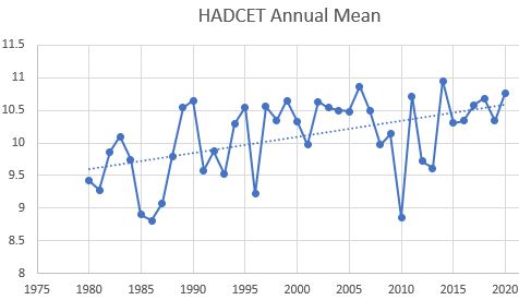 The average of the five years ending 1990 was 9.77, the five years ending 2020 was 10.54, a rise of 0.25C / decade if my arithmetic is right.