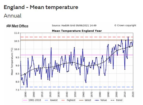 England has warmed up 0.5C in the last 270 years ( big deal !) as from the end of the Maunder Minimum and deepest depth of LIA and possibly 8,000 years minimum. England’s temperature is climbing back towards its millennial averages.