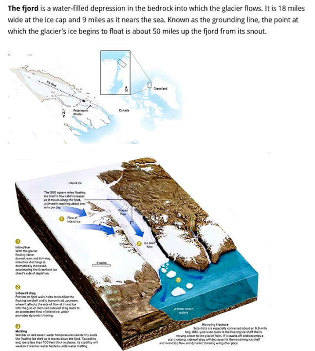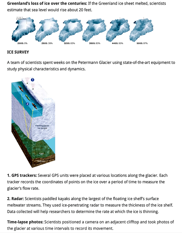 The article closed by noting that scientists say that if all the Greenland ice melted that ocean sea levels would rise by 20 feet and then mentioned various ways glacier flow is measured as shown below.