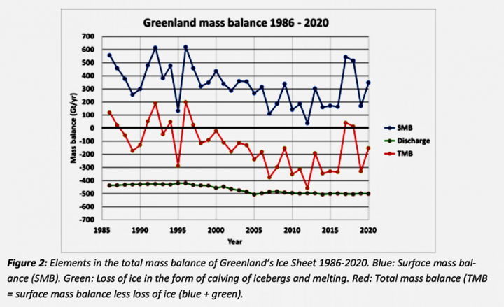 Additionally, the report provides Greenland ice mass balance outcomes over the past 35 years as provided in the reports graph shown below.