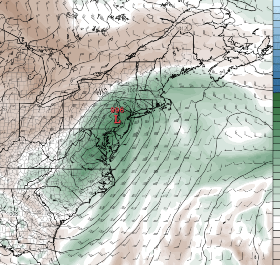 To the east of the low center, there was a warm front, as indicated by the National Weather Service analysis for 8 PM EDT (indicated by the black half circles)