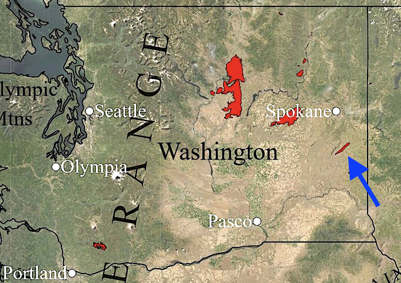 The route of the fire, in arid eastern Washington. was nearly entirely grass, wheat fields, and small bushes. Isolated trees were not a significant fuel source of the fire and most of them remained green after the fires. A satellite image of the path is shown below (GoogleEarth Pro).