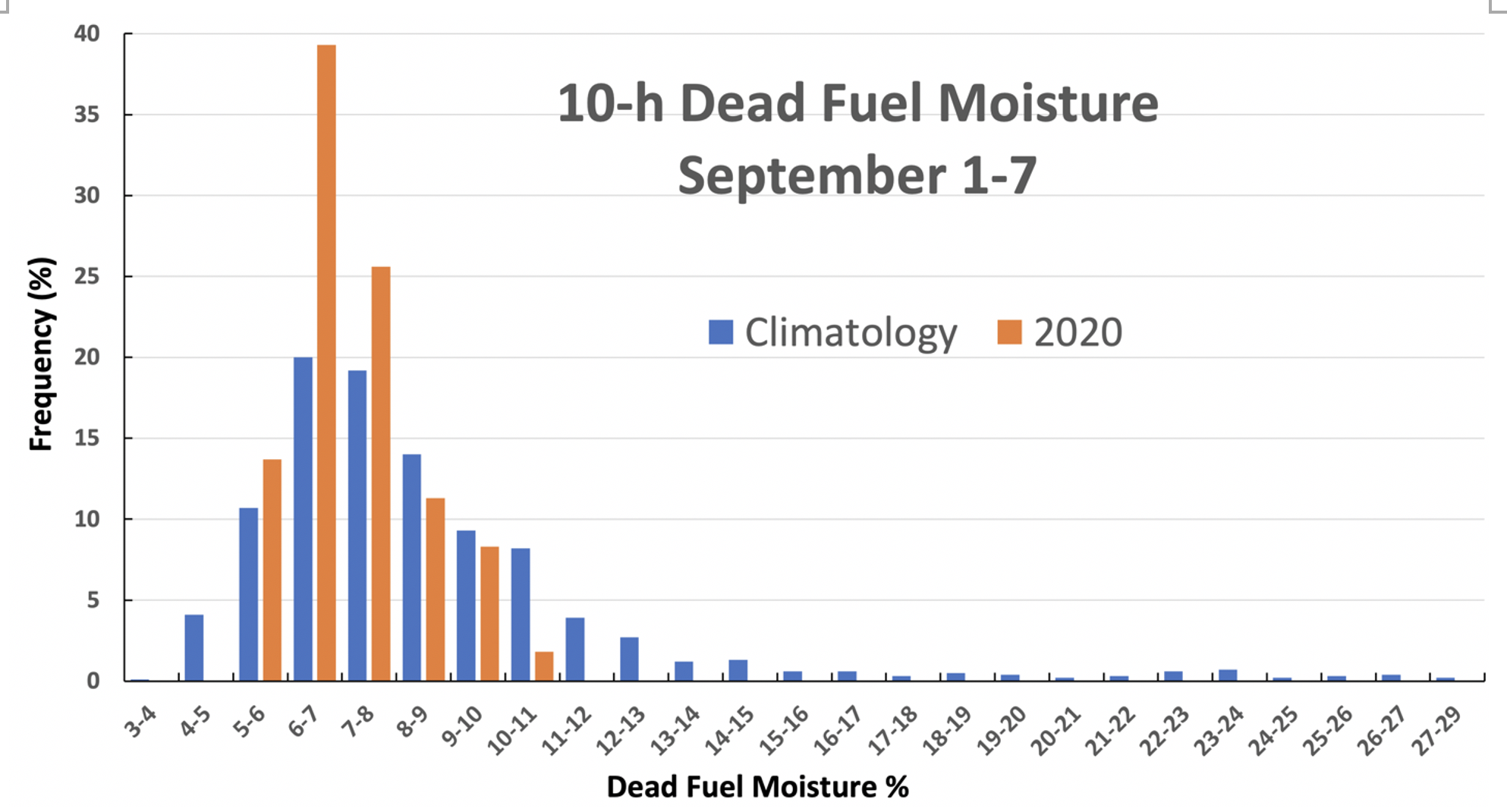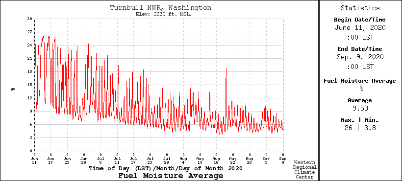 Fire danger from light fuels is greatly reduced when the 10-h dead fuel moisture is above 20%, but there is great danger below 10%, which was evident in September 2020 and is typical for late summer.