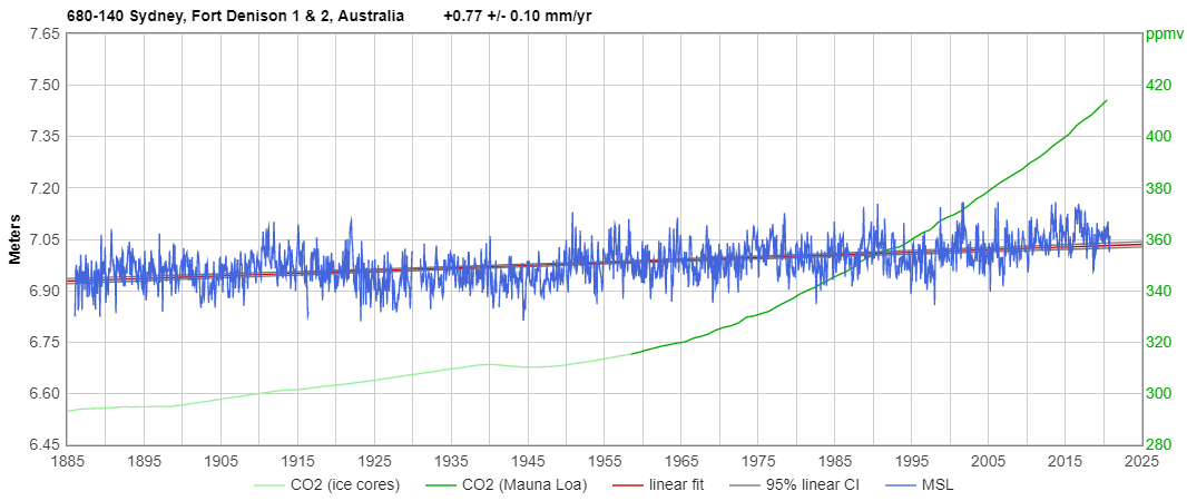 Certainly not at Fort Denison (Sydney). That has been averaging less than 1mm per year compared to the 2 to 3mm commonly cited as average sea level rise.