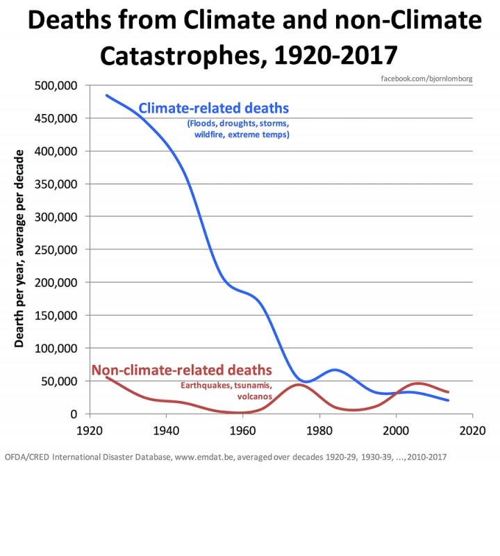 Let me allow some remarks concerning the picture. The title: “Deaths from Climate and non-Climate Catastrophes, 1920-2017”. This wording offers counter-argumentations for the warmunists:
