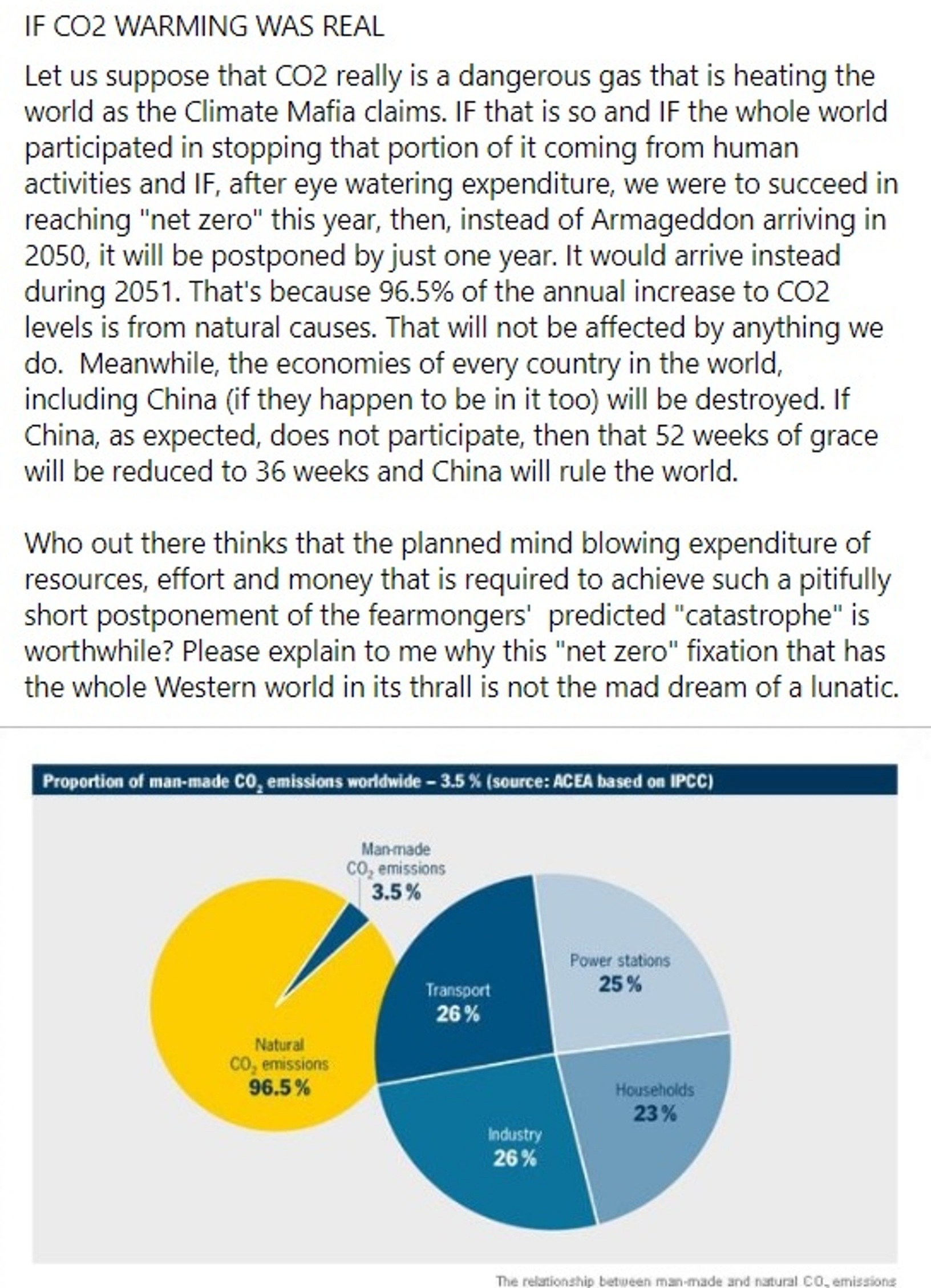 The ‘natural 96.5% CO2 emissions’ are merely part of the natural carbon cycle i.e. over time there is no natural increase in the atmospheric CO2 concentration as a result.