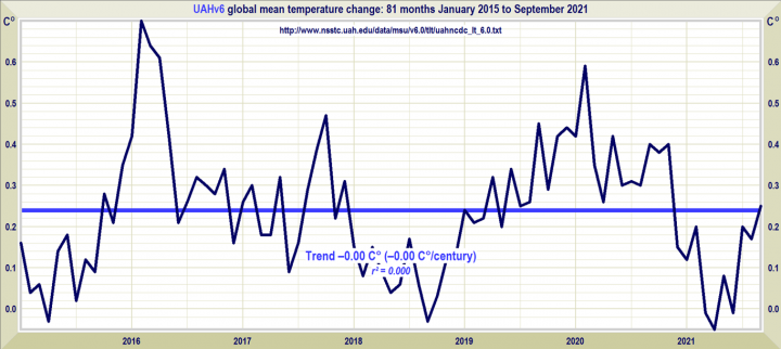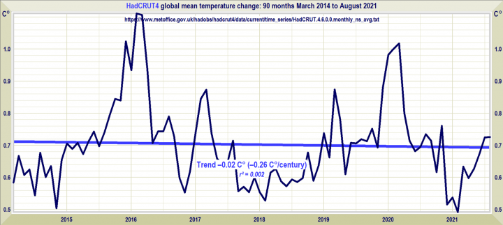 HadCRUT4 has at last updated its surface-temperature record to August 2021, showing no global warming for 7 years 6 months. For almost all the period between IPCC’s 2013 and 2021 Assessment Reports, there has been no global warming at all.