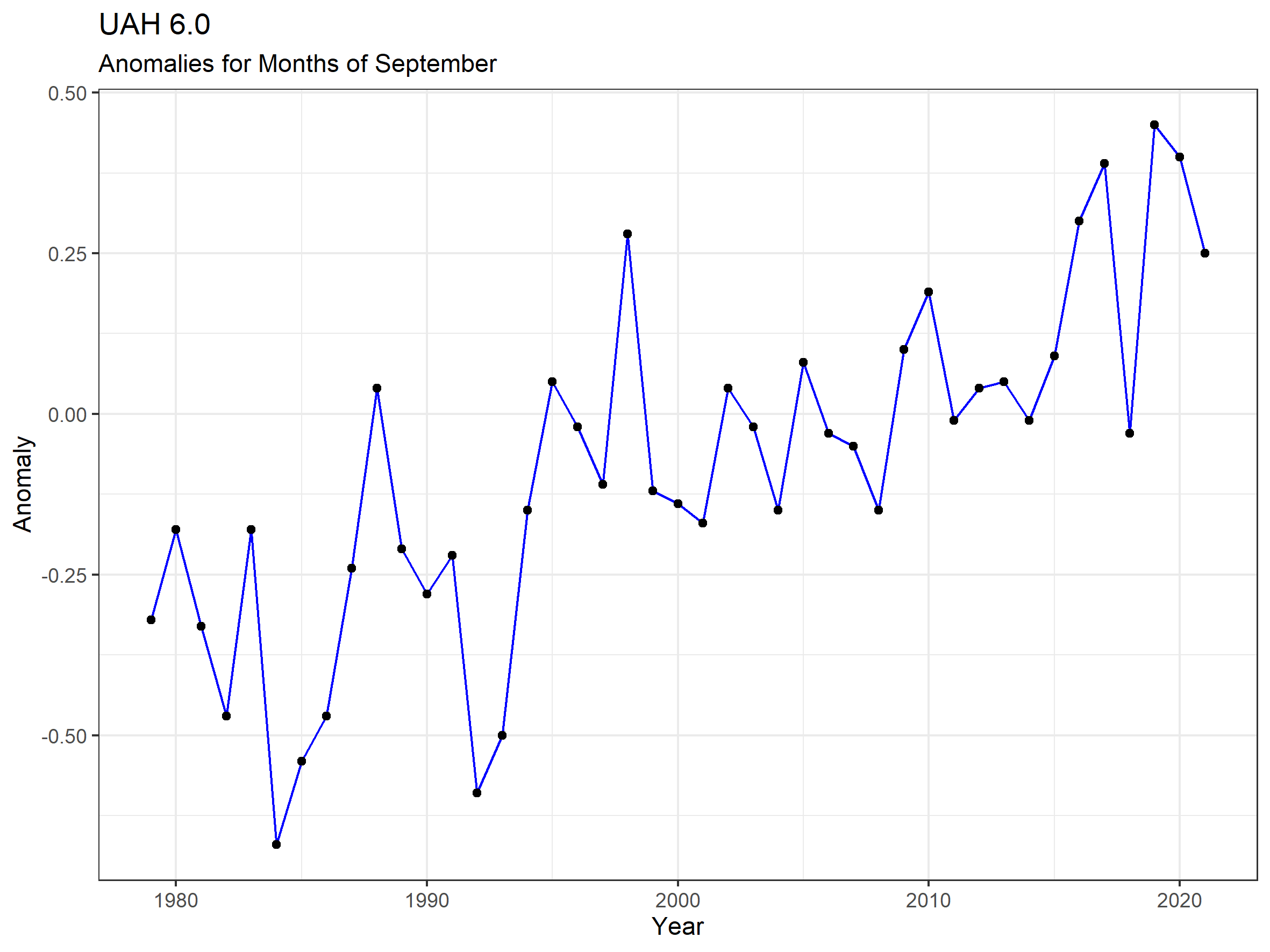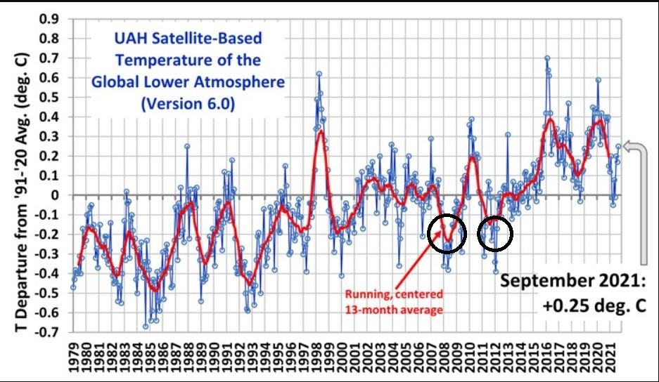 The Version 6.0 global average lower tropospheric temperature (LT) anomaly for September, 2021 was +0.25 deg. C, up from the August, 2021 value of +0.17 deg. C.