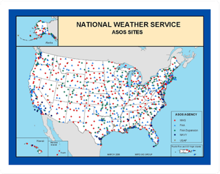 The National Weather Service and the Federal Aviation Administrations have weather observation equipment at every major and minor airport across the U.S. (see map). Roughly 1000 of them.