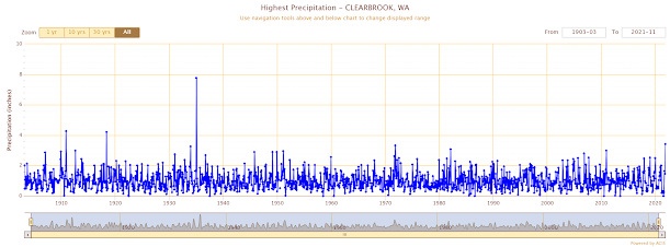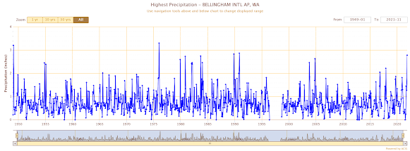 Let’s look at the data. Karin Bumbaco, Associate Washington State Climatologist, graciously provided me with plots of annual maximum 24-h rainfall at Bellingham, WA, and at the nearby Clearbrook official climatological observing site, with the latter having a very long record (see below).
