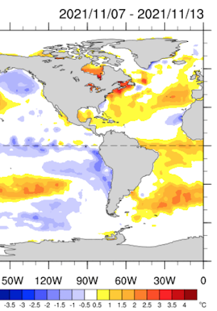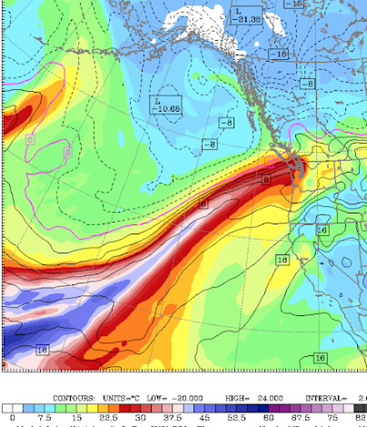 Below are the sea surface temperature anomalies (differences from normal) for the period leading up and including the atmospheric river in question. It was cooler than normal immediately off our coast and near normal for virtually the entire path of the atmospheric river. With La Nina conditions, the water temperatures near the equator were BELOW normal. No sign of a global warming contribution.