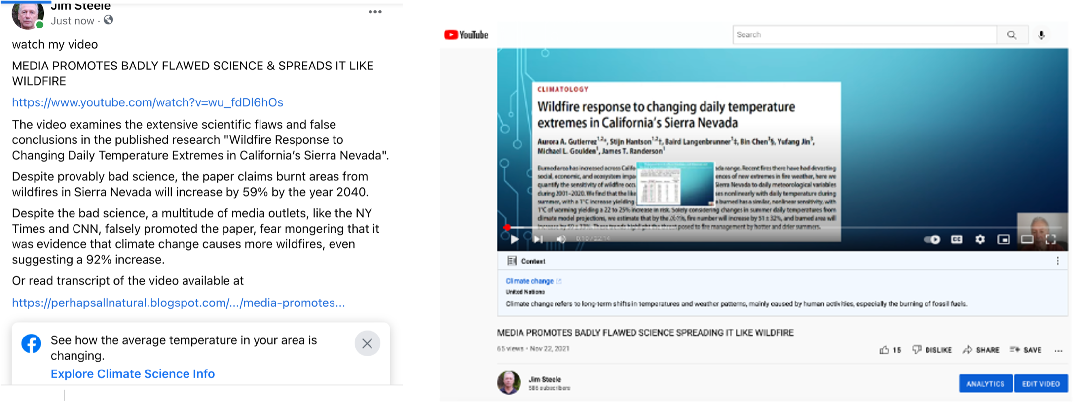 The video examines the extensive scientific flaws and false conclusions in the published research “Wildfire Response to Changing Daily Temperature Extremes in California’s Sierra Nevada”. Despite the bad science a multitude of media outlets like NY Times and CNN falsely promoted the paper as evidence that climate change cause more wildfires