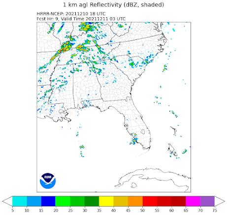 9-h NOAA/NWS HRRR model Forecast at 03 UTC 11 December (9 PM CST 10 Dec)