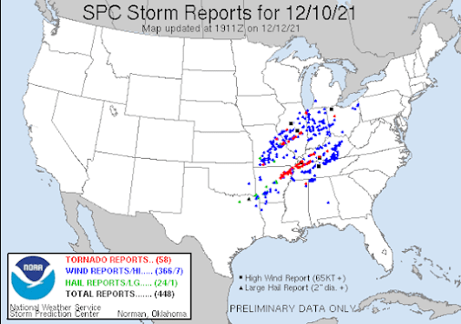 The death toll was undoubtedly enhanced by the nighttime occurrence of these storms and their development during the winter season, which is unusual but not unprecedented. The storms occurred in two coherent lines oriented southwest to northeast, as shown by the tornado reports (red dots) provided by the NOAA/NWS storm prediction center. For reference, the tornadoes hit Mayfield, KY around 10 PM Friday evening.