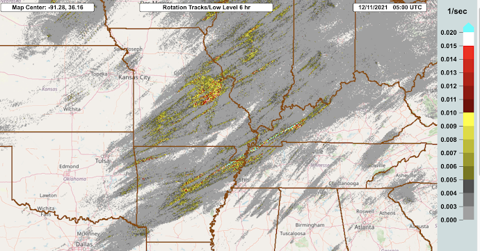 We can track this rotation over time, and doing so, the path of rotating storms for the period around the worse tornado occurrence on Friday evening is shown below. You can see the amazingly straight path of the narrow zone of rotation that extends from Arkansas, into Tennessee, and Kentucky. There is also a line of rotation associated with other severe storms to the north.